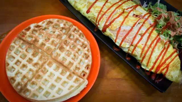华夫饼简直就是明星百搭单品,吃什么都能配。即点即做,拿在手上奶香扑面而来,松软棉糯的样子让人很想立即扑上去。
